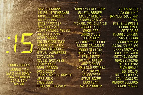 David Adix, Tucson · Julie Anand and Damon Sauer, Phoenix · Jack Balas, Tucson · Rebecca Barten, Bisbee · Curt Brill, Tucson · Miles Conrad, Tucson · Craig Cully, Tucson · Simon Donovan, Tucson · David Elliott, Tucson · Fausto Fernandez, Phoenix · Ken Figueredo · Dan Fogel, Tempe · Fotovitamina (Rosanna Salonia and Matthew Yates), Tucson · David Gibbs, Tucson · Denis Gillingwater, Phoenix · A. Brooke Heuts, Phoenix · Oliver Hibert, Scottsdale · Alan Bur Johnson, Jerome · Jeffrey Jonczyk, Tucson · Saskia Jorda, Scottsdale · Larry Kornegay, Paradise Valley · William LeGoullon, Scottsdale · Cameron Luft, Gilbert · Rose Moon, Sedona · Kathleen Scott Moore, Tempe · Ann Morton, Phoenix · Michael Mulno, Tempe · John Randall Nelson, Tempe · Christina You-Sun Park, Tempe · James Patterson, Tubac · Benjamin William Phillips, Phoenix · Lisa Robinson, Tucson · Josh Schaffer, Tucson · Gary Setzer, Tucson · Shannon Smith, Tucson · Mike Stack,Tucson · Ann Tracy-Lopez, Tucson · Lisa Von Koch, Tempe · Cara Walz, Tucson · A.T. Willett, Tucson · Tessa Windt, Phoenix · Kelsey Viola Wiskirchen, Tempe · Richard Zelens, Tucson.